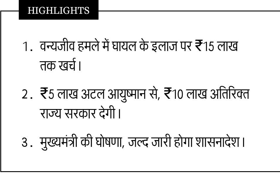 हाल में ही मुख्यमंत्री ने वन्यजीवों के हमले में घायल व्यक्तियों के उपचार में 10 लाख रुपये तक का खर्च सरकार की ओर से वहन करने की घोषणा की थी। अब इस दिशा में तेजी से कदम बढ़ाए जा रहे हैं। सरकार के निर्णय के अनुरूप वन विभाग की ओर से शासन को प्रस्ताव भेजा गया है।