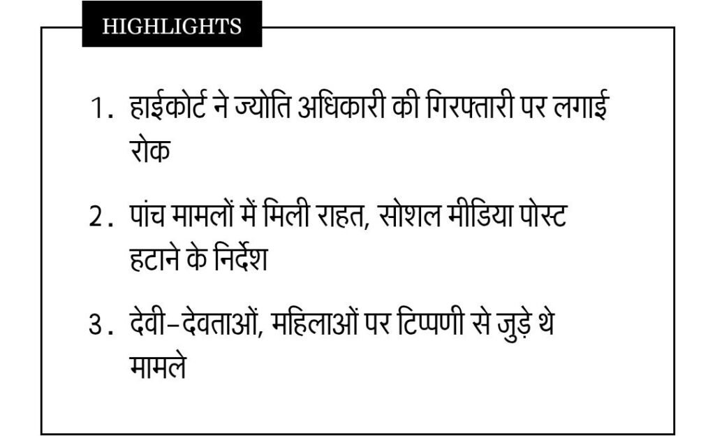मंगलवार को शीत अवकाशकालीन न्यायाधीश न्यायमूर्ति आलोक मेहरा की एकलपीठ ने ज्योति को राहत देते हुए पांच मुकदमों में गिरफ्तारी पर रोक लगा दी है। साथ ही राज्य सरकार से तीन सप्ताह में जवाब पेश करने को कहा है। कोर्ट ने ज्योति अधिकारी से इन मामलों से संबंधित उनकी ओर से इंटरनेट मीडिया में पोस्ट तत्काल हटाने के निर्देश दिए हैं, ताकि जिससे कोई और कोई आहत न को। कोर्ट ने कहा कि इंटरनेट मीडिया में पोस्ट करते वक्त उचित भाषा का चयन करना आवश्यक है। जिससे कोई आहत न हो।