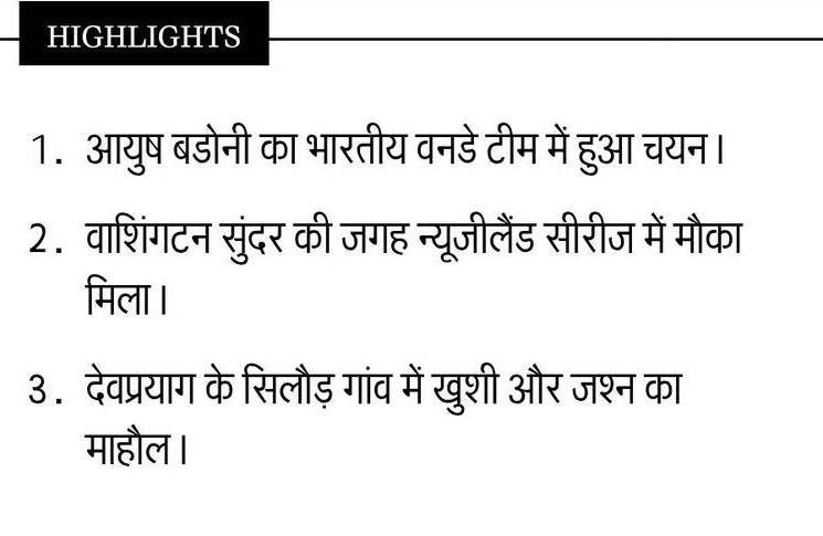 न्यूजीलैंड के खिलाफ वनडे सीरीज में आयुष बडोनी के भारतीय टीम में चयन होने से देवप्रयाग के सिलौड़ गांव में जश्न का माहौल है। वाशिंगटन सुंदर की जगह टीम में शामिल हुए 26 वर्षीय आयुष, जो दिल्ली रणजी और आईपीएल में लखनऊ जायंट्स के लिए खेलते हैं, को ग्रामीण युवाओं के लिए प्रेरणा मान रहे हैं। उनके इस प्रदर्शन से पूरे गांव में खुशी की लहर है।